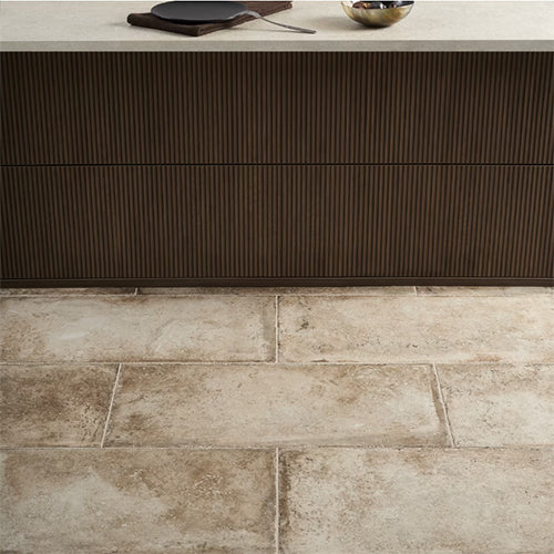 Enjoy the timeless look of travertine with the Caruso Delfi dark beige 12x24 Travertine Look matte porcelain tile. Its natural, earthy stone surface has an authentic, antique look at the edges.